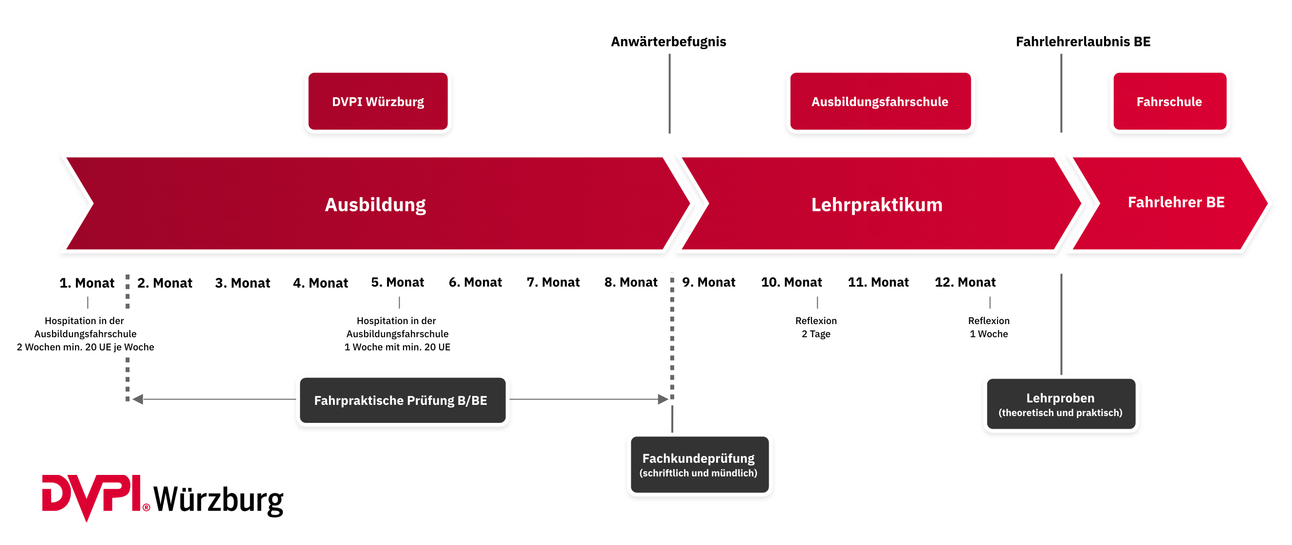 | Ausbildung | 1 Monat Berufsorientierung, 7 Monate Lehrgang im DVPI und 4 Monate Lehrpraktikum in einer Ausbildungsfahrschule |